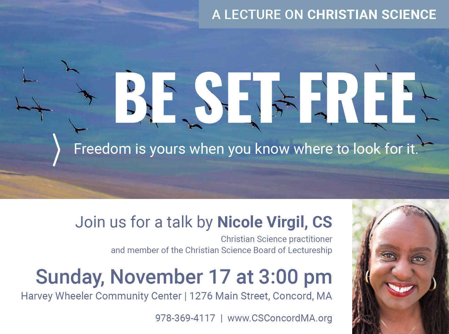 Join the First Church of Christ, Scientist, Concord, for a lecture on Christian Science by Nicole Virgil, CS, Christian Science practitioner and member of Christian Science Board of Lectureship, Sunday, Nov. 17, 3 p.m. Harvey Wheeler Community Center, 1276 Main St. Concord. For more information visit www.CSConcordMA.org