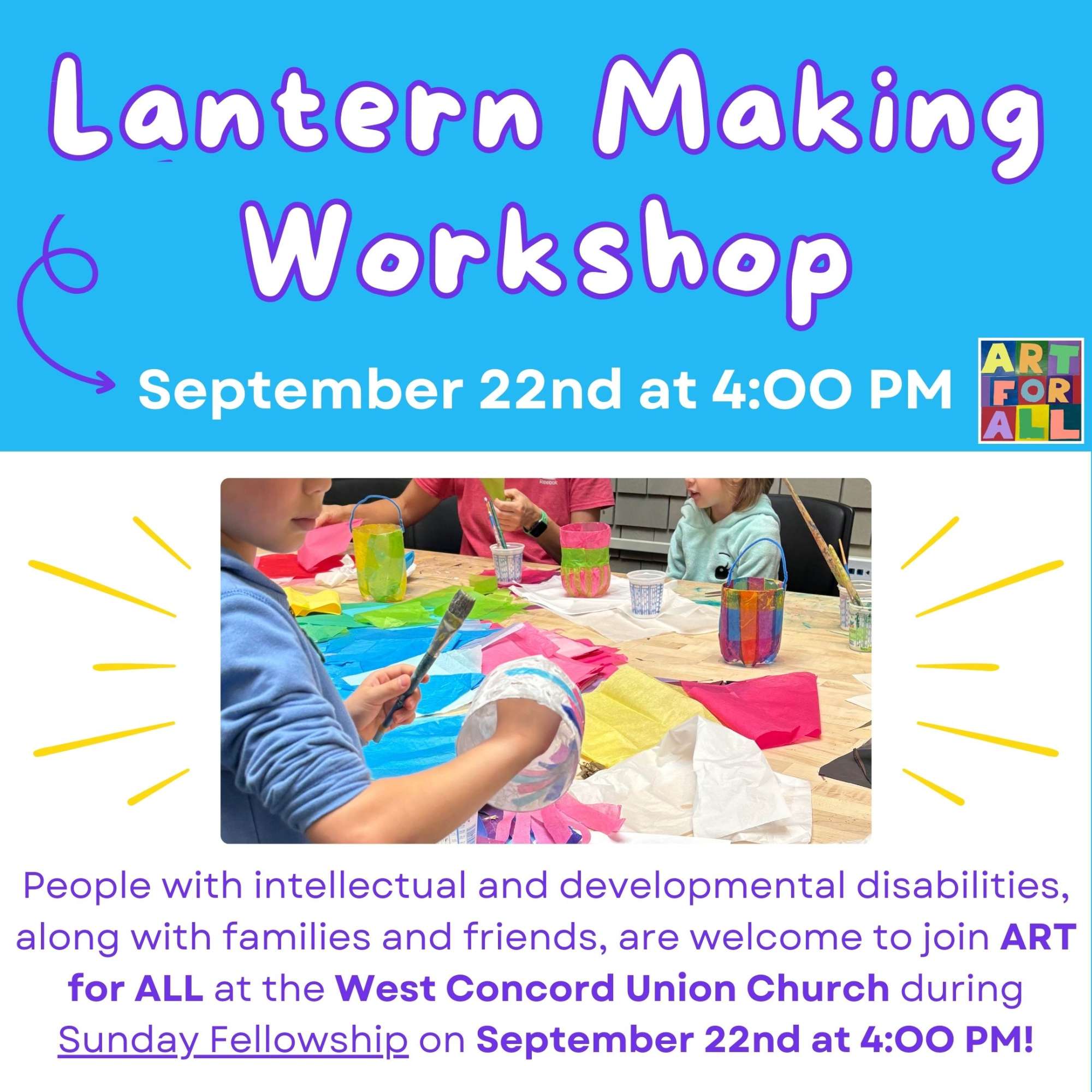 People with intellectual and developmental disabilities, along with families and friends, are welcome to join ART for ALL at the West Concord Union Church during Sunday Fellowship on September 22nd at 4:00. Sunday Fellowship is a ministry of worship and friendship for people of all abilities.