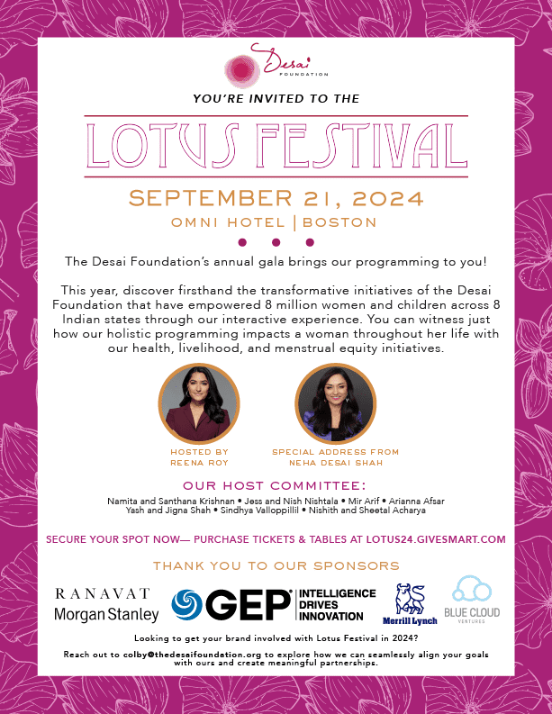 Join us at the Desai Foundation’s annual Lotus Festival Gala on September 21 at the Omni Hotel in Boston! Experience the transformative initiatives of the Desai Foundation firsthand as bring our programming to you! Celebrate with us as we highlight the empowerment of 8 million women and children across 8 Indian states through interactive experiences showcasing our holistic programming in health, livelihoods, and menstrual equity. Enjoy a plated dinner, full bar, music and incredible experiences to bid on during our auction! Plus, you won’t want to miss out on our speakers Reena Roy and Neha Desai Shah. Secure your tickets and tables now!
