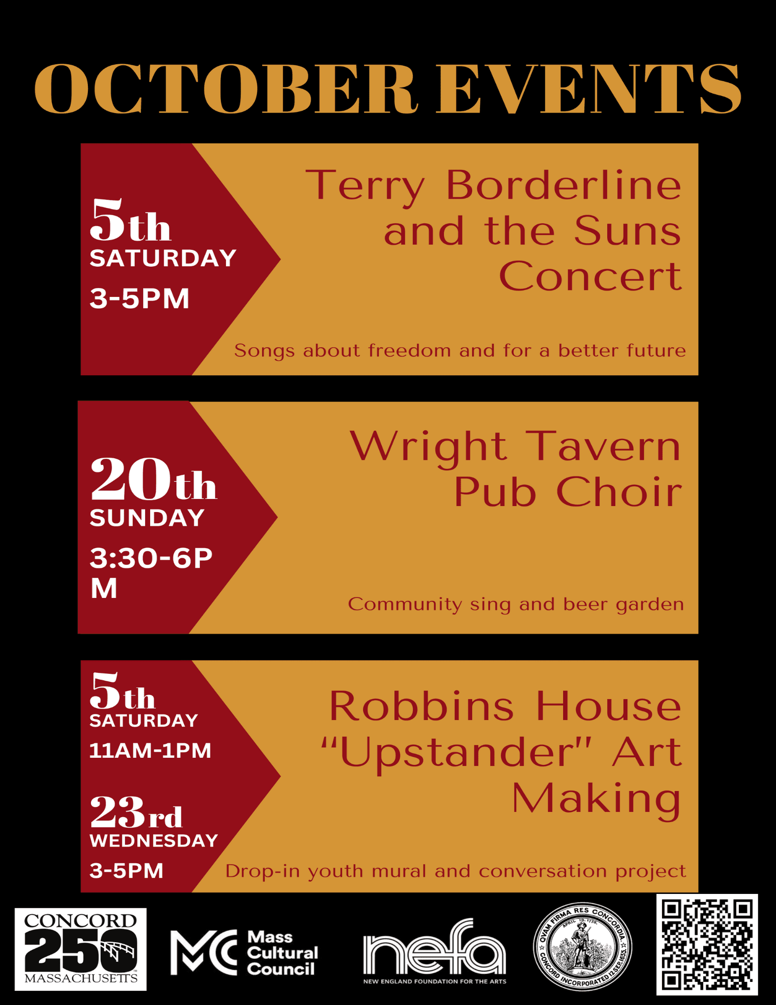 Full listing of Freedom’s Silhouette Companion Events: Freedom Concert: Terry Borderline and the Suns Date: Saturday, October 5 Time: 3:00 PM to 5:00 PM Location: Monument Square, Concord MA Join us for an electrifying performance by Terry Borderline and the Suns. This seven-piece band will perform a set of original songs about freedom, spirituality, nature, and social justice, including an original piece inspired ...