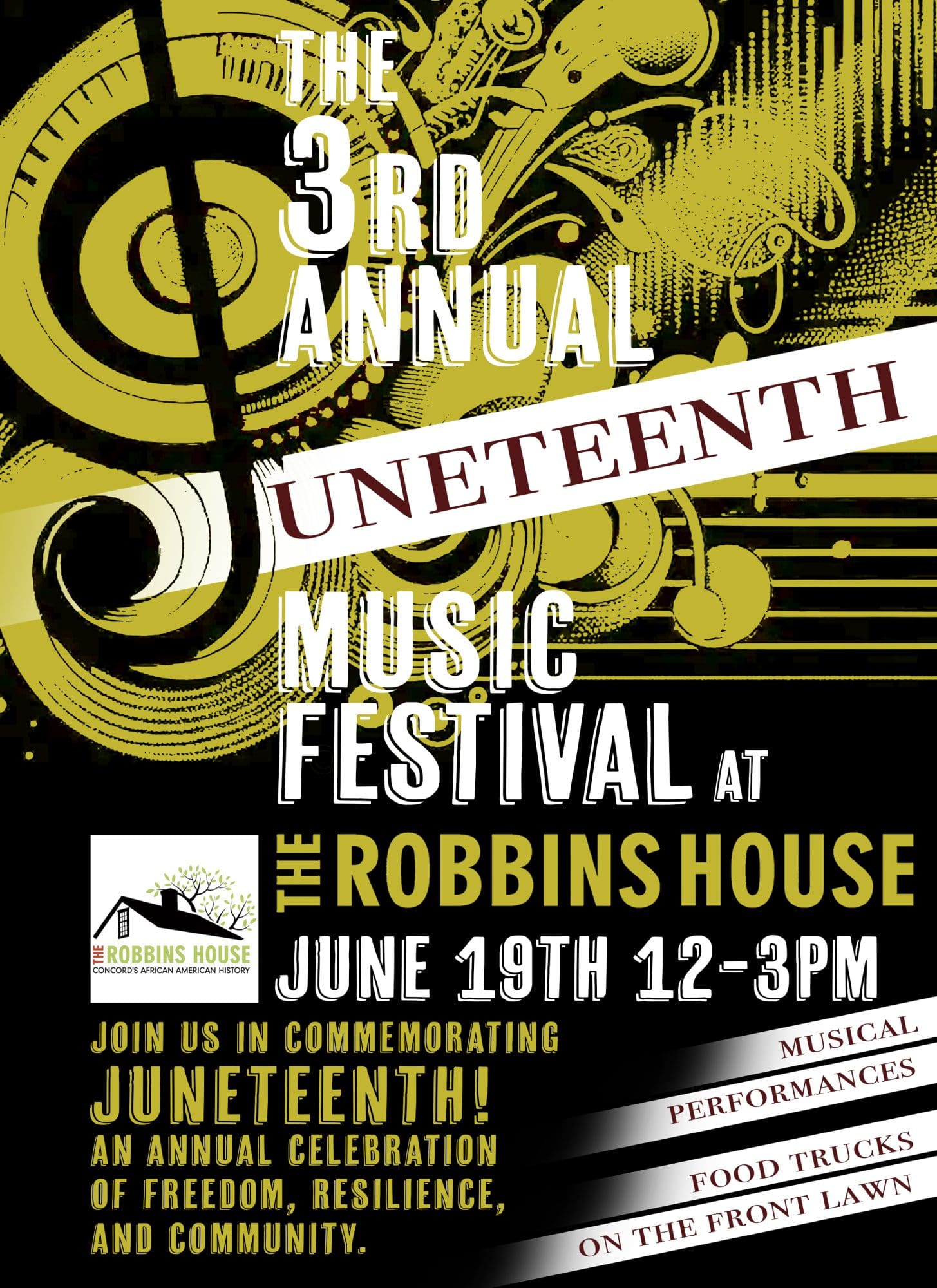 Thursday, June 19th, 2025 from 12-3 at The Robbins House. Join us for the third annual Juneteenth Music Festival at The Robbins House. Come hear musical performances from area groups and enjoy food trucks on the front lawn of the musuem in celebration of freedom, resilience, and community.