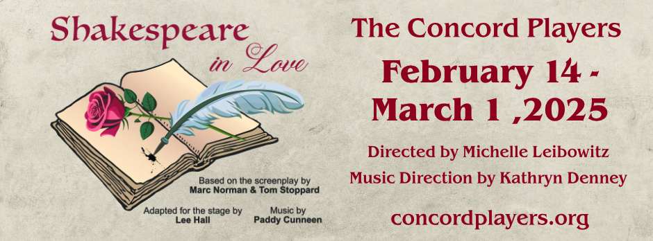 The Concord Players presents Shakespeare In Love February 14 – March 1, 2025 It’s 1593 in London, and sometime player / playwright William Shakespeare is struggling to finish his latest work ‘Romeo and Ethel, the Pirate’s Daughter’. Disguised as a man (since women are forbidden on the stage) young Viola de Lesseps auditions and wins a leading role in this new ...